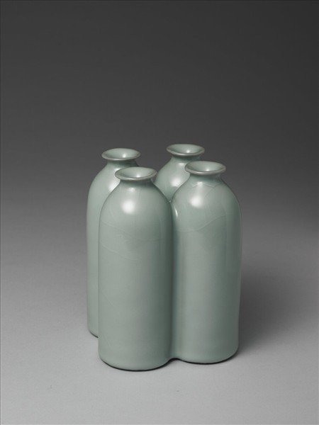 全器由四個筒狀瓶子聚組而成,瓶子皆呈撇口、短頸、深長腹、平底、淺挖足的造型。整件作品裡外罩施仿汝青瓷釉,釉色瑩潤,四瓶底緣皆露褐色胎,各個瓶底以青花書「雍」、「正」、「年」、「製」四字篆款。這種將四個相同器式連結成一器的製作,未見於前朝,可說是雍正官窯的創新器形之一。