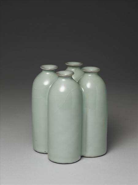 全器由四個筒狀瓶子聚組而成,瓶子皆呈撇口、短頸、深長腹、平底、淺挖足的造型。整件作品裡外罩施仿汝青瓷釉,釉色瑩潤,四瓶底緣皆露褐色胎,各個瓶底以青花書「雍」、「正」、「年」、「製」四字篆款。這種將四個相同器式連結成一器的製作,未見於前朝,可說是雍正官窯的創新器形之一。