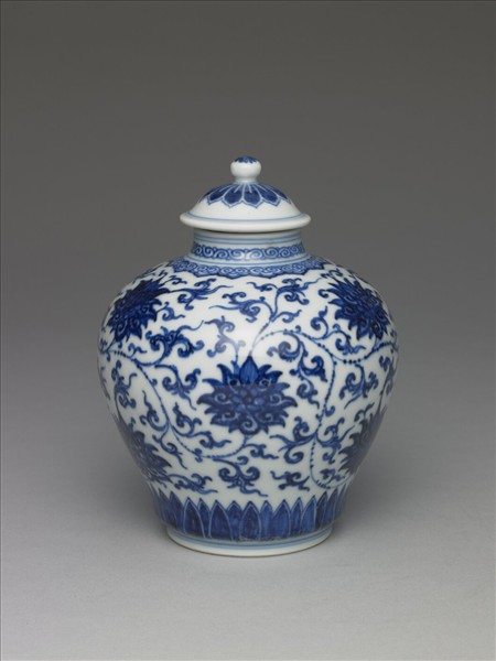 圓口,短頸,碩腹下斂,圈足,帶笠形蓋。全器以釉下鈷藍繪飾紋樣。蓋面蓮瓣一圈。器外壁繪纏枝番蓮花葉,大朵盛開的番蓮,以及旋繞蔓生的枝葉滿佔外壁,只在近底處繪飾尖形葉一圈。特別的是,外壁面上的花葉線條,往往以顏色較重的青料點飾其間,顯然是模仿明代青花鐵鏽斑的效果。足緣露胎一圈,足內釉下青花書「大清雍正年製」雙行六字楷款,外加雙圈。