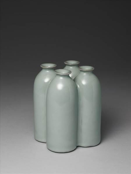 全器由四個筒狀瓶子聚組而成,瓶子皆呈撇口、短頸、深長腹、平底、淺挖足的造型。整件作品裡外罩施仿汝青瓷釉,釉色瑩潤,四瓶底緣皆露褐色胎,各個瓶底以青花書「雍」、「正」、「年」、「製」四字篆款。這種將四個相同器式連結成一器的製作,未見於前朝,可說是雍正官窯的創新器形之一。