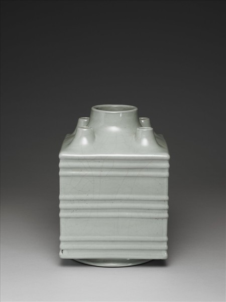 器主體作長方形柱體,肩上五圓口,圈足。五口皆短頸,管內中空,與器體相通。外壁有凸起九道弦紋,三道一組,分別位於器外壁的最上、最下與中央部分,除此之外無任何紋飾。外壁施青釉,釉凝潤而呈色灰。外底四角見有支釘痕。圈足露胎一圈塗褐色汁,足內滿釉釉下青花書:「大清雍正年製」三行六字篆款。