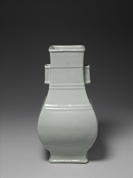 長方形,唇口,雙貫耳,碩腹,長方形足外撇,整器模仿青銅器貫耳壺的造型,器壁平整,為模製成形的效果。頸側凸起弦紋一道,頸肩交界處以及腹部上半部,皆凸起兩道弦紋。外壁施青釉,釉色灰青。足緣露胎一圈,著地處寬,足內滿釉,釉下青花書「大清雍正年製」三行六字篆款。
