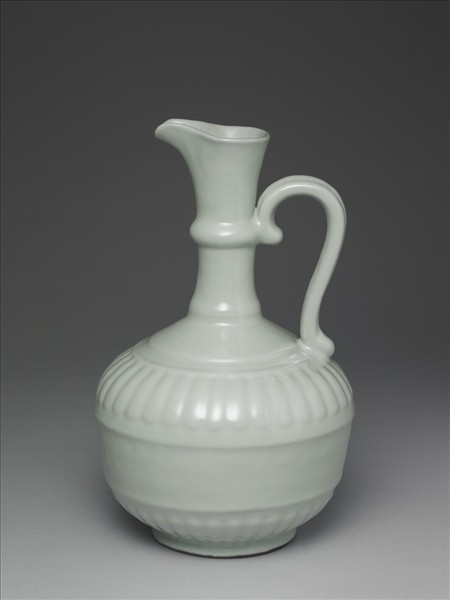 侈口短流,直長頸,中段飾一凸棱,斜肩上下各起稜線三道,器腹扁圓形,上下各模印仰覆菊瓣凸紋,平底,矮圈足。頸、肩安裝一曲形把手。全器施青釉,釉色凝潤,也讓器表凸出的箍稜、菊瓣裝飾,顯得更為柔和。足緣露胎一圈,塗褐色汁,足內滿釉,釉下青花書「大清雍正年製」三行六字篆款。同式器亦見以青花為飾者,如院藏〈清 雍正 青花菊瓣花澆〉(故瓷17683)即是。