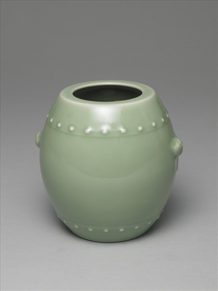 鼓式瓷罐,外型有如平削兩端的橄欖,圓口,口沿向內折,鋪首啣環,平底內凹成足。外壁施仿官釉,釉青綠而凝潤。外壁上下各凸起乳丁一圈,除此之外光素無紋。底外露胎無釉區一圈,中心釉下青花書「大清乾隆年製」三行六字篆款。