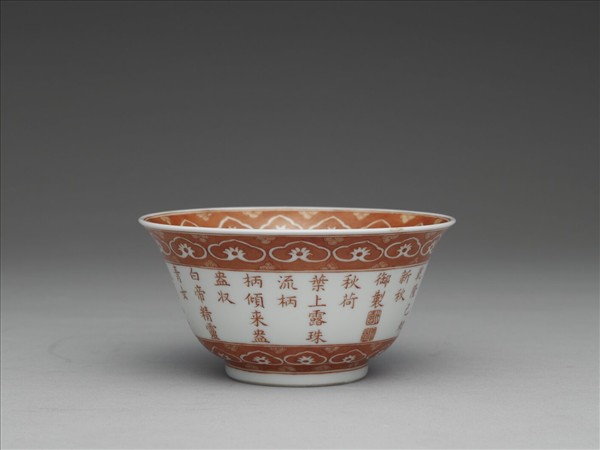 撇口,深壁,圈足。通體以礬紅描繪花紋,口足內外各為紅底留白如意紋飾,杯外白地上書乾隆御製詩一首,內底繪池中荷花、荷葉。外圍與口足有相同的如意紋一周。胎體輕薄,質地細膩,紅彩鮮豔。器底礬紅書「大清乾隆年製」六字三行篆款。外壁所書的御製詩,為乾隆二十四年(1759,己卯)清高宗所作之〈荷露烹茶〉:「秋荷葉上露珠流,柄柄傾來盎盎收。白帝精靈青女氣,惠山竹鼎越窑甌。學仙笑彼金盤妄,宜詠欣兹玉乳浮。李相若曾經識此,底須置驛遠馳求。」(《御製詩集二集》卷八十八)詩文後加識:「〈荷露烹茶〉一律,乾隆己卯新秋御製」,並描有朱方:「比德」、白方「朗潤」印記。院藏另有同式之〈清 乾隆 描紅三清詩茶碗〉(故瓷17581),該作乃是紀乾隆十一年(1746)清高宗以雪水烹煮三清茶之事,故其上詩文,即為清高宗當時所作之〈三清茶〉一詩。而由本器外壁之詩文看來,本器則為紀念乾隆皇帝以荷露烹茶之作。一為雪水煮三清茶,一烹荷露透茶香,時事雖殊、風雅正同。