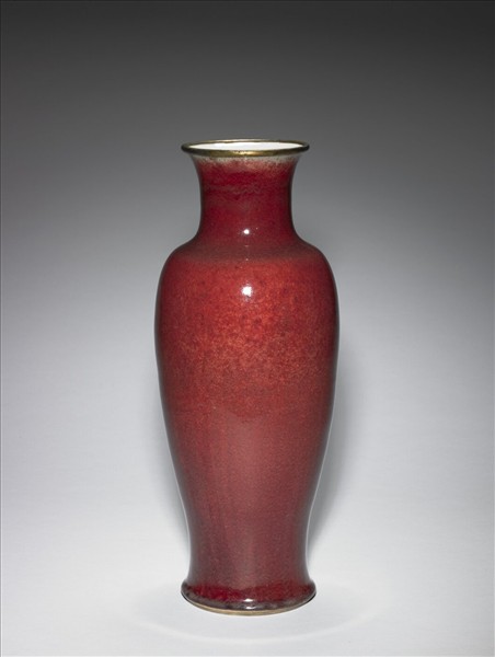 頸直長略粗,口稍外撇,與肩相接成圓聳,順著線條而下腹部內收,至足稍向外伸延,器身有如挺立的觀音像,因而稱之為觀音瓶。器表施銅紅釉,發色容易受火焰的影響而成各種變化,能有如此紅豔的發色,非常難得。此類紅釉燒造時往往容易釉流至足下,有此現象者往往將足磨切整平。銅紅釉在永樂、宣德時燒造得極為成功,愈往後愈不如前。直到康熙時,由郎延極任江西巡撫,兼管景德鎮時,燒出紅豔生動的銅紅釉,這種釉的燒成相當困難,因此得到了極高的讚譽,而將其歸之於監督官的功勞,因此以監督官的姓冠之於此類產品,稱之為「郎窯紅」。康熙後期出現的豇豆紅及雍正以後的銅紅釉又轉成另一類,但屬於銅紅釉的在後來往往全以「郎窯紅」稱之,可見其成就。