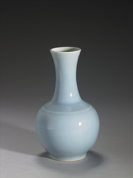 撇口,長頸,斜肩,圓腹,圈足,頸肩處有兩道棱紋。器表施青釉,呈淡淡的灰藍色。足底周緣露胎,加塗褐色鐵汁,呈淺褐色,底以青花書「大清雍正年製」三行六字楷書款。