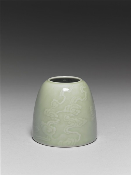 水盛。圓口棱,深壁,上斂下豐,平底,淺挖成足。器外壁堆花作流雲紋。裏外均施冬青釉,色柔和;釉薄處見白骨。器底施白釉,青花楷書「大清康熙年製」六字三行款。