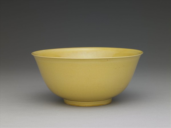 微撇口,深弧壁,矮圈足。全器內外壁均施黃釉,釉色濃艷明亮。外壁施釉至足際,足邊修釉齊整。足圈露胎,圈足內底施白釉,並書「大清康熙年製」六字雙行雙圈青花楷書款。