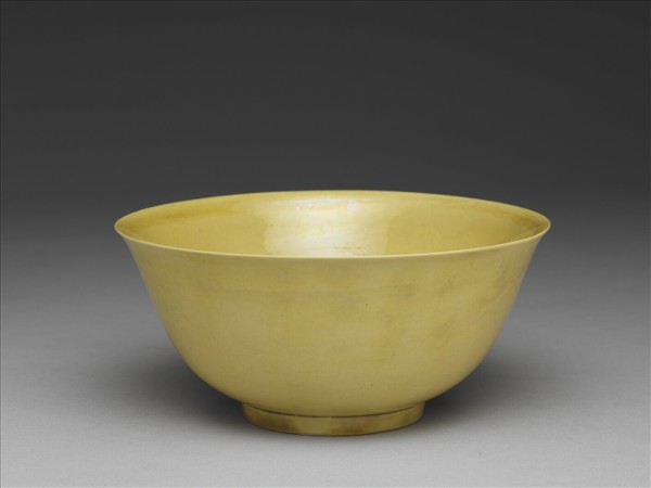 微撇口,深弧壁,矮圈足。全器內外壁均施黃釉,釉色濃艷明亮。外壁施釉至足際,足邊修釉齊整。足圈露胎,圈足內底施白釉,並書「大清康熙年製」六字雙行雙圈青花楷書款。