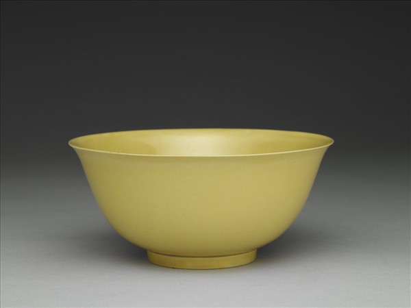微撇口,深弧壁,矮圈足。全器內外壁均施黃釉,釉色濃艷明亮。外壁施釉至足際,足邊修釉齊整。足圈與圈足內底施白釉,並書「大清康熙年製」六字雙行雙圈青花楷書款。