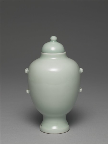 直口,斜肩,長斂腹,兩側各貼飾二橋形繫耳,高圈足外撇,足上有二個長方形穿孔,圓鈕穹頂形蓋。全器施青釉,光素無紋。圈足足底周緣露胎,底施青釉,以青花書「大清雍正年製」三行六字篆書款。