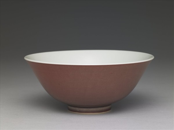 微撇口,深弧壁,矮圈足。全器內壁施白釉,外壁施暗紅色釉至足際,足邊修釉齊整,釉色濃厚。圈足內底施白釉,並書「大清雍正年製」六字雙行雙圈青花楷書款。