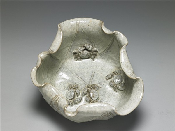 器作一荷葉上捲為洗,侈口,深弧壁,平底。通體施白釉,色灰白光潤,密佈細小的灰色開片紋,器內外皆劃有荷葉經絡紋理,洗內貼飾螃蟹四隻,整體造形活潑有生趣。器底有六枚支釘痕。螃蟹與荷葉寓意「和諧」。
