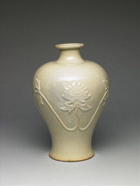 梅瓶小口出唇外撇,短頸,豐肩,碩腹下歛,平底,圈足。通體施白釉,色牙白泛黃,帶細密的淺灰色開片,腹部飾堆花連枝牡丹紋一枝。器底無釉,露淡黃色胎。