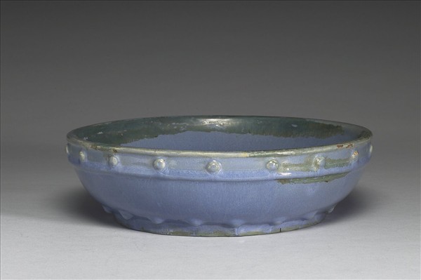 侈口窄邊,淺弧壁,圈足,釉層有部份剝落。通體施鈞釉,釉色青紫,剝釉處呈褐色,口外緣與足上各飾凸起鼓釘紋一道。器底露胎,塗赭色汁,中陰刻一「五」字。