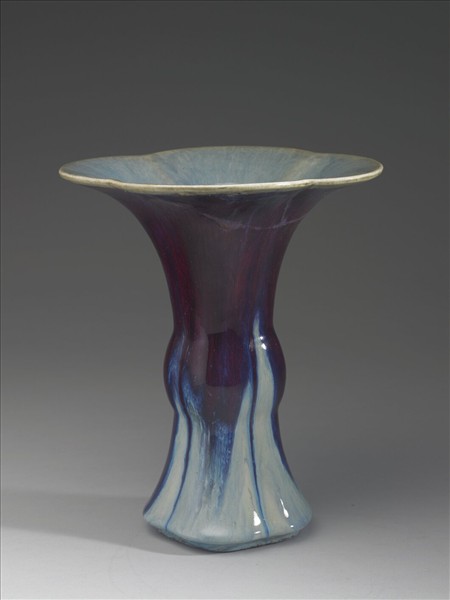 瓶,器仿青銅器觚形,通體做四瓣棱海棠式,喇叭口,束頸,鼓腹,撇足。通體施爐鈞釉,呈紅、靛、天藍、月白等多色深淺混雜流動窯變釉,釉汁濃積於底緣。器內作淺月白藍色。器底呈米黃色,底心印「大清乾隆年製」六字三行篆款,圈足露胎,施護胎汁,呈深褐色。仿鈞窯變釉為雍正時出現的新品種,係仿鈞釉色系,採多次施釉,燒成過程中,不同金屬元素自然結合所產生的流動窯變釉色。