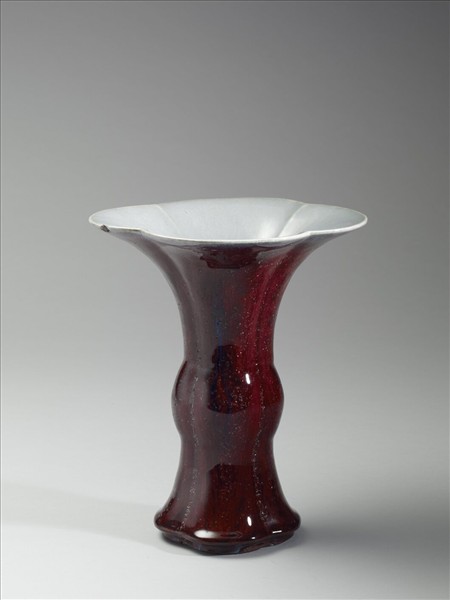 瓶,器仿青銅器觚形,通體做四瓣棱海棠式,喇叭口,束頸,鼓腹,撇足。通體施爐鈞釉,呈紅、靛、天藍、月白等多色深淺混雜流動窯變釉,本器以紅釉為主色調,釉汁濃積於底緣。器內作淺月白藍色。器底呈米黃色,底心印「大清乾隆年製」六字三行篆款,圈足露胎,施護胎汁,呈深褐色。仿鈞窯變釉為雍正時出現的新品種,係仿鈞釉色系,採多次施釉,燒成過程中,不同金屬元素自然結合所產生的流動窯變釉色。