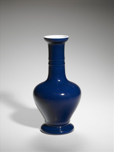 盤口,折沿,直長頸,斜肩,斂腹,外撇圈足。頸飾凸弦紋兩道,器內施透明釉,外施霽青釉,釉質光滑潤澤。足底緣露胎,胎質細緻潔白,底部中心內凹,施透明釉,書青花「大清雍正年製」六字雙行楷書款,外圍雙圈。