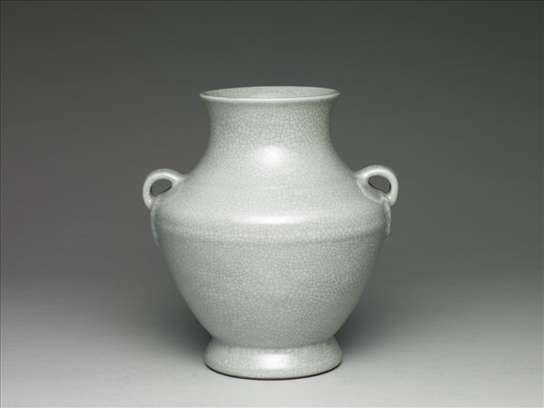 撇口,斜肩,肩立雙環耳,下接如意形暗耳,斂腹,外撇圈足。全器施灰青釉,釉面密佈開片紋。足端露胎,塗赭色汁,底部有青花書「大清雍正年製」六字三行篆書款。