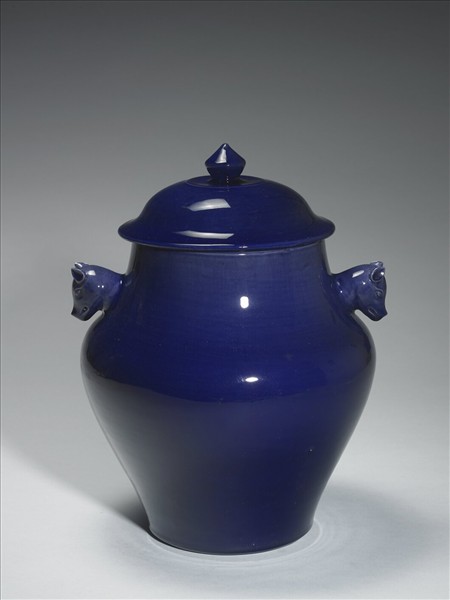 廣口圓罐,歛口,斜圓肩,腹部上廣下歛,肩兩側橫出有獸頭形耳,平底,帶寶珠鈕圓頂蓋,頂有小通氣孔。通體施霽青釉,釉色勻潤光亮。器底有三處墊燒痕,留有窯渣,中央無釉。同樣造型亦見於黃釉、紅釉、影青釉,皆作祭祀用器。