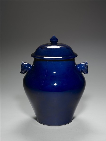 廣口圓罐,斂口,斜圓肩,腹部上廣下斂,肩兩側橫出有獸頭形耳,平底,帶寶珠鈕圓頂蓋,頂有小通氣孔。通體施霽青釉,釉色勻潤光亮。器底有三處墊燒痕,留有窯渣,中央無釉。同樣造型亦見於黃釉、紅釉、影青釉,皆作祭祀用器。
