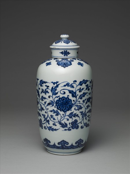 小圓口,短頸,寬肩,長直腹,矮圈足,帶寶珠鈕蓋。全器以青花描繪紋飾,器肩及近底處畫如意紋圖案一周,腹部繪纏枝花卉。蓋面繪蓮瓣紋,蓋壁則以花葉紋裝飾,蓋鈕繪五瓣花紋。底書「大清雍正年製」青花六字二行楷款。