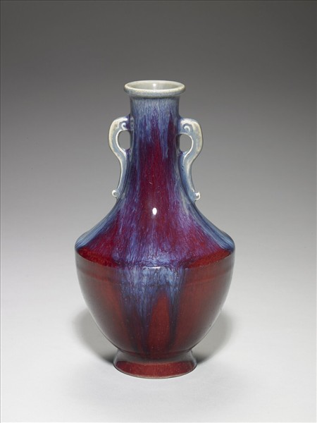 唇口,長頸,雙雲耳,折肩,腹部下斂,撇足。通體施鈞紅釉,呈紅、靛、紫、月白等多色深淺混雜流動窯變釉,口內與雲形板耳則多作淺月白藍色。器底施米白色釉,底心刻「大清乾隆年製」六字三行篆款。仿鈞窯變釉為雍正時出現的新品種,係仿鈞釉色繁衍而來,其先高溫燒成器胎,後上釉於低溫中燒成,燒成過程中,不同金屬元素自然結合。所產生的流動窯變釉色,一般呈色偏紅者,稱「火焰紅」,偏藍者,稱「火焰青」。