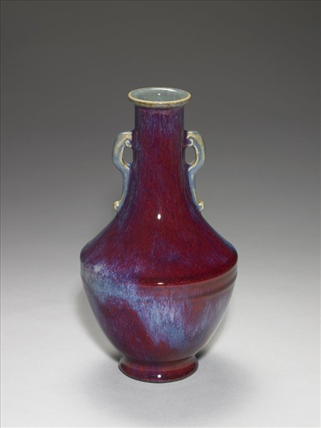 唇口,長頸,雙雲耳,折肩,腹部下斂,撇足。通體施鈞紅釉,呈紅、靛、紫、月白等多色深淺混雜流動窯變釉,口內與雲形板耳則多作淺月白藍色。器底施米白色釉,但似乎含有雜質,故多處呈鐵褐色。底心刻「大清乾隆年製」六字三行篆款。仿鈞窯變釉為雍正時出現的新品種,係仿鈞釉色繁衍而來,採多次施釉,燒成過程中,不同金屬元素自然結合。所產生的流動窯變釉色,一般呈色偏紅者,稱「火焰紅」,偏藍者,稱「火焰青」。