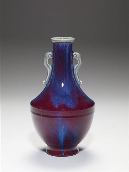 小唇口,長頸,雙耳,折肩,腹部下斂,撇足。通體施鈞紅釉,呈紅、靛、紫、月白等多色深淺混雜流動窯變釉,口內與雲形板耳則多作淺月白藍色。器底施醬釉,底心印「大清乾隆年製」六字三行篆款,圈足露胎,塗赭色汁。仿鈞窯變釉為雍正時出現的新品種,係仿鈞釉色繁衍而來,採多次施釉,燒成過程中,不同金屬元素自然結合。所產生的流動窯變釉色,一般呈色偏紅者,稱「火焰紅」,偏藍者,稱「火焰青」。