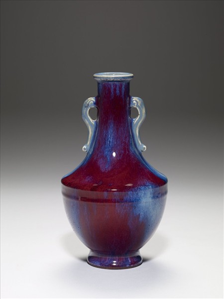 小唇口,長頸,雙耳,斜折肩,腹部下斂,撇足。通體施爐鈞釉,色作鈞紅,呈紅、靛、紫、月白等多色深淺混雜流動窯變釉,口內與雲形板耳則作淺月白藍色。器底施醬釉,底心印「大清乾隆年製」六字三行篆款,圈足露胎,塗赭色汁。