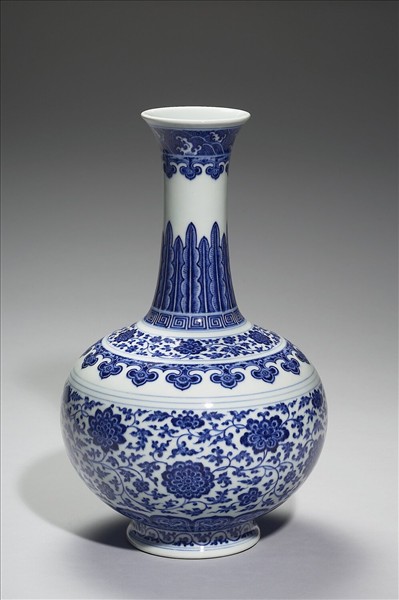 瓷胎,撇口,長頸,溜肩,圓腹,圈足。以青花繪紋為飾,口緣繪水波紋,下接一圈如意雲紋,頸部繪蕉葉紋,下接一圈回紋,肩部繪折枝番蓮紋及如意雲紋,腹部繪番蓮紋,下緣繪蓮瓣紋,圈足外繪卷草紋。足緣露胎,胎質緻密呈白色。底有「大清乾隆年製」三行鈷藍篆書款。