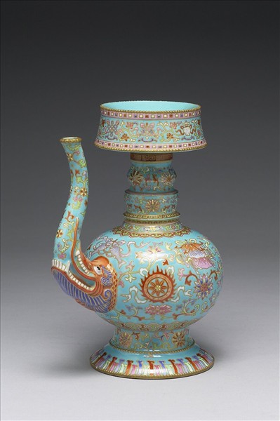 侈口,口沿外翻,階式頸,斜肩,圓腹,曲流,圈足外撇。通體施湖綠色釉,器表以色釉繪製圖紋,口沿及腹部飾佛教八寶:寶瓶,寶傘,白蓋,盤長,金魚,法螺,蓮花,法輪,間以番蓮紋,腹部下緣飾如意雲紋;頸部、流及圈足為轉枝番蓮紋,流底部以龍首為飾,圈足飾一圈番蓮瓣紋,全器圖紋皆描金邊。足緣呈淺褐色。底施湖綠釉金書「大清乾隆年製」三行篆書款。與中瓷000440N000000000為一對。