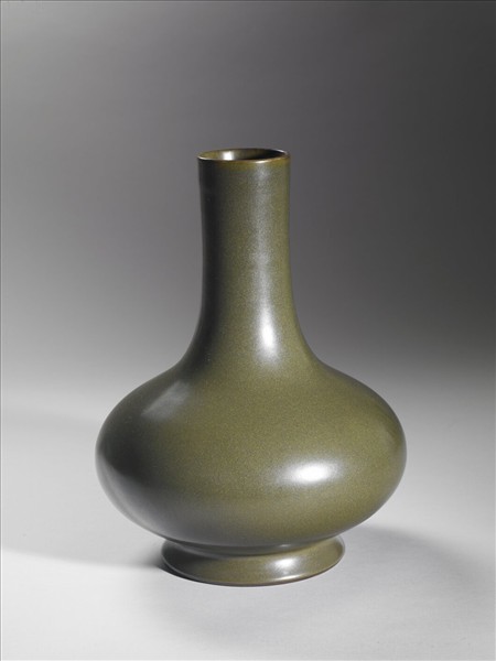 圓口,長直頸,碩腹,圈足外撇。全器施廠官釉,俗稱茶葉末釉。足塗褐色護胎汁,足內印「大清乾隆年製」三行六字篆款。