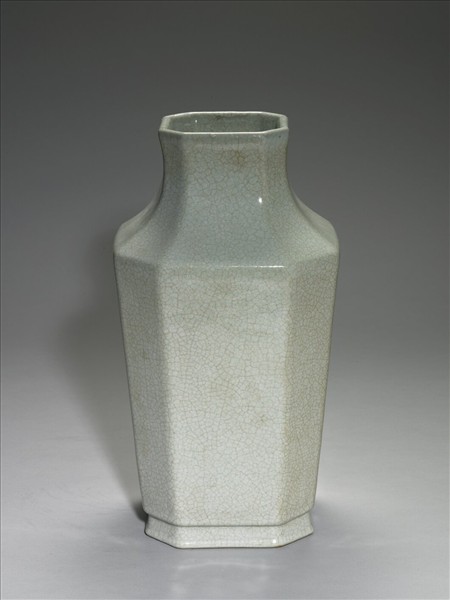 瓷胎,八邊形,直口,短頸,斜肩,直斂腹,八邊形矮圈足。全器施青釉,釉面上有細密淺褐色開片紋。足緣平,呈褐色,底於青釉中有「大清乾隆年製」三行鈷藍篆書款。