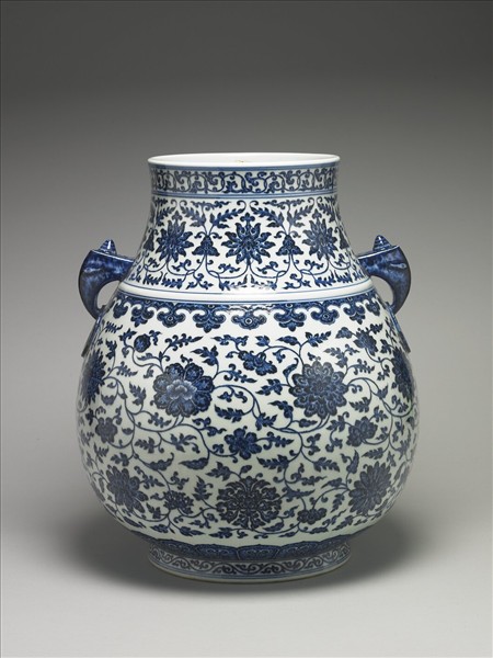 白地青花,口略侈,短頸外弛,碩腹,圈足,獸耳啣環。頸飾蓮花,腹壁滿繪纏枝番蓮紋。外口緣飾捲葉紋、頸下如意雲頭、足邊蓮瓣、圈足捲草紋各一圈。圈足內有「大清乾隆年製」三行六字篆款。此器一式兩件成對。