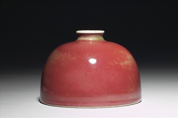 小口微外侈,短頸溜肩,廣腹,形似半圓球,平底凹足。器身施銅紅釉,因受窯爐溫度影響,呈色有深淺之別,類似豇(音同姜)豆色澤,故有豇豆紅釉之說。器腹淺劃三組暗花團螭紋,口沿及器內施白釉,外底有「大清康熙年製」楷體款識。此類小口半圓穹狀的器型一般被稱為「太白尊」,然而清宮檔案舊稱為「花囊」。對照西洋傳教士殷弘緒的書簡,得知是以吹釉法施釉。