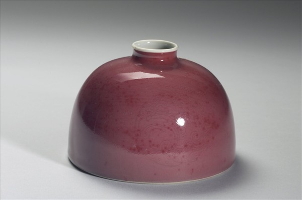 小口微外侈,短頸溜肩,廣腹,形似半圓球,平底凹足。器身施銅紅釉,因受窯爐溫度影響,呈色有深淺之別,類似豇(音同姜)豆色澤,故有豇豆紅釉之說。器腹淺劃三組暗花團螭紋,口沿及器內施白釉,外底有「大清康熙年製」楷體款識。此類小口半圓穹狀的器型一般被稱為「太白尊」,然而清宮檔案舊稱為「花囊」。對照西洋傳教士殷弘緒的書簡,得知是以吹釉法施釉。