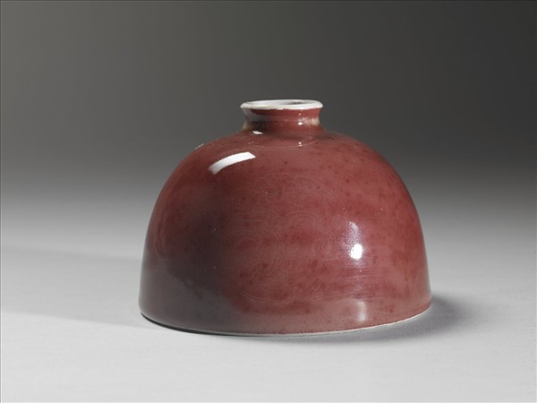 小口微外侈,短頸溜肩,廣腹,形似半圓球,平底凹足。器身施銅紅釉,因受窯爐溫度影響,呈色有深淺之別,類似豇(音同姜)豆色澤,故有豇豆紅釉之說。器腹淺劃三組暗花團螭紋,口沿及器內施白釉,外底有「大清康熙年製」楷體款識。此類小口半圓穹狀的器型一般被稱為「太白尊」,然而清宮檔案舊稱為「花囊」。對照西洋傳教士殷弘緒的書簡,得知是以吹釉法施釉。