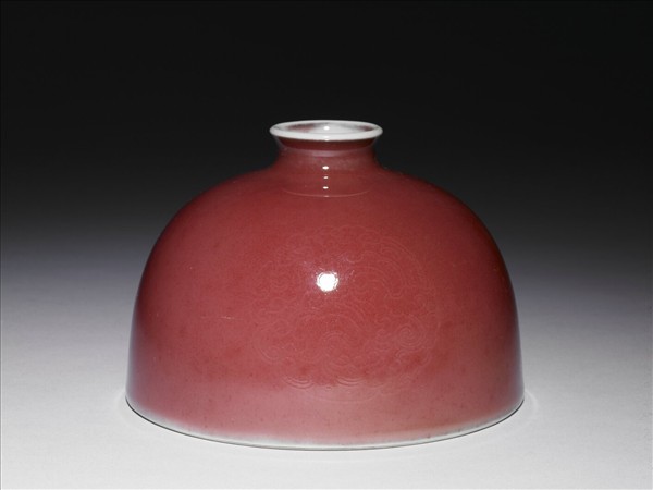 小口微外侈,短頸溜肩,廣腹,形似半圓球,平底凹足。器身施銅紅釉,因受窯爐溫度影響,呈色有深淺之別,類似豇(音同姜)豆色澤,故有豇豆紅釉之說。器腹淺劃三組暗花團螭紋,口沿及器內施白釉,外底有「大清康熙年製」楷體款識。此類小口半圓穹狀的器型一般被稱為「太白尊」,然而清宮檔案舊稱為「花囊」。對照西洋傳教士殷弘緒的書簡,得知是以吹釉法施釉。