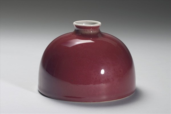 小口微外侈,短頸溜肩,廣腹,形似半圓球,平底凹足。器身施銅紅釉,因受窯爐溫度影響,呈色有深淺之別,類似豇(音同姜)豆色澤,故有豇豆紅釉之說。器腹淺劃三組暗花團螭紋,口沿及器內施白釉,外底有「大清康熙年製」楷體款識。此類小口半圓穹狀的器型一般被稱為「太白尊」,然而清宮檔案舊稱為「花囊」。對照西洋傳教士殷弘緒的書簡,得知是以吹釉法施釉。