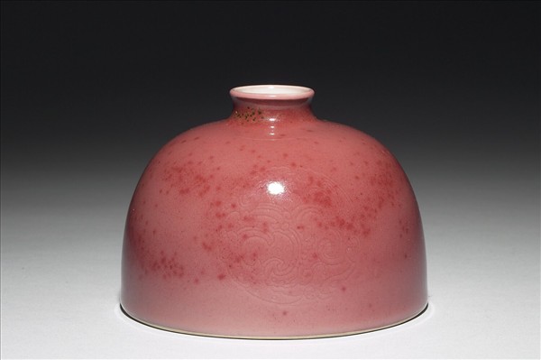 小口微外侈,短頸溜肩,廣腹,形似半圓球,平底凹足。器身施銅紅釉,因受窯爐溫度影響,呈色有深淺之別,類似豇(音同姜)豆色澤,故有豇豆紅釉之說。器腹淺劃三組暗花團螭紋,口沿及器內施白釉,外底有「大清康熙年製」楷體款識。此類小口半圓穹狀的器型一般被稱為「太白尊」,然而清宮檔案舊稱為「花囊」。對照西洋傳教士殷弘緒的書簡,得知是以吹釉法施釉。