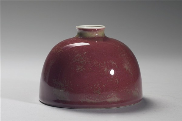 小口微外侈,短頸溜肩,廣腹,形似半圓球,平底凹足。器身施銅紅釉,因受窯爐溫度影響,呈色有深淺之別,類似豇(音同姜)豆色澤,故有豇豆紅釉之說。器腹淺劃三組暗花團螭紋,口沿及器內施白釉,外底有「大清康熙年製」楷體款識。此類小口半圓穹狀的器型一般被稱為「太白尊」,然而清宮檔案舊稱為「花囊」。對照西洋傳教士殷弘緒的書簡,得知是以吹釉法施釉。