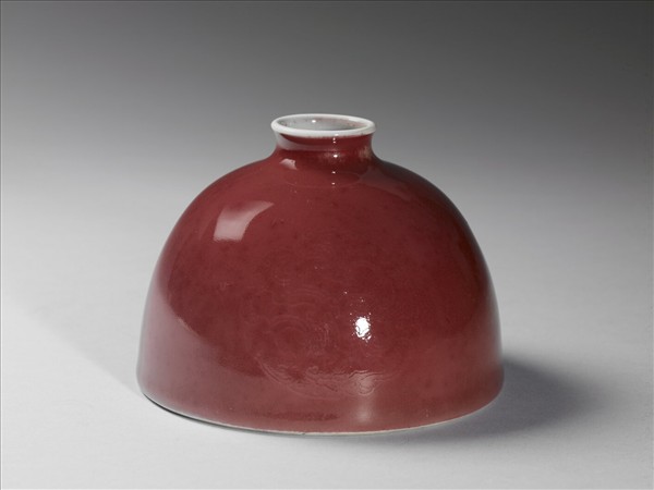 小口微外侈,短頸溜肩,廣腹,形似半圓球,平底凹足。器身施銅紅釉,因受窯爐溫度影響,呈色有深淺之別,類似豇(音同姜)豆色澤,故有豇豆紅釉之說。器腹淺劃三組暗花團螭紋,口沿及器內施白釉,外底有「大清康熙年製」楷體款識。此類小口半圓穹狀的器型一般被稱為「太白尊」,然而清宮檔案舊稱為「花囊」。對照西洋傳教士殷弘緒的書簡,得知是以吹釉法施釉。
