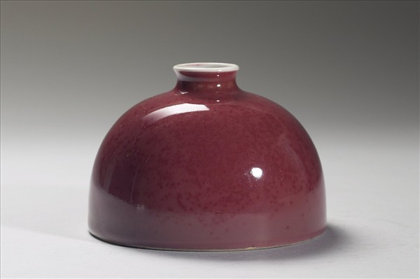小口微外侈,短頸溜肩,廣腹,形似半圓球,平底凹足。器身施銅紅釉,因受窯爐溫度影響,呈色有深淺之別,類似豇(音同姜)豆色澤,故有豇豆紅釉之說。器腹淺劃三組暗花團螭紋,口沿及器內施白釉,外底有「大清康熙年製」楷體款識。此類小口半圓穹狀的器型一般被稱為「太白尊」,然而清宮檔案舊稱為「花囊」。對照西洋傳教士殷弘緒的書簡,得知是以吹釉法施釉。