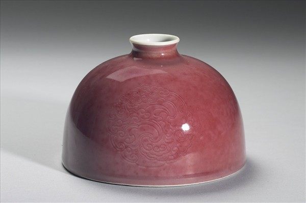 小口微外侈,短頸溜肩,廣腹,形似半圓球,平底凹足。器身施銅紅釉,因受窯爐溫度影響,呈色有深淺之別,類似豇(音同姜)豆色澤,故有豇豆紅釉之說。器腹淺劃三組暗花團螭紋,口沿及器內施白釉,外底有「大清康熙年製」楷體款識。此類小口半圓穹狀的器型一般被稱為「太白尊」,然而清宮檔案舊稱為「花囊」。對照西洋傳教士殷弘緒的書簡,得知是以吹釉法施釉。