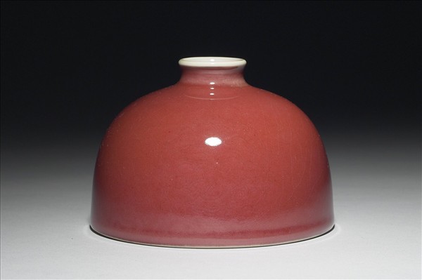 小口微外侈,短頸溜肩,廣腹,形似半圓球,平底凹足。器身施銅紅釉,因受窯爐溫度影響,呈色有深淺之別,類似豇(音同姜)豆色澤,故有豇豆紅釉之說。器腹淺劃三組暗花團螭紋,口沿及器內施白釉,外底有「大清康熙年製」楷體款識。此類小口半圓穹狀的器型一般被稱為「太白尊」,然而清宮檔案舊稱為「花囊」。對照西洋傳教士殷弘緒的書簡,得知是以吹釉法施釉。