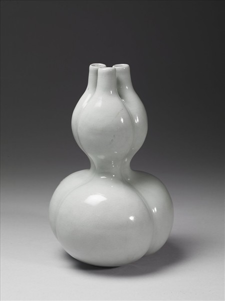 三連葫蘆瓶,器式為三葫蘆作「品」字排列併接而成,三瓣形足。全器施罩冬青釉,釉色勻淨瑩潤而偏白色,圈足露胎,塗褐色汁,足內青釉地「大清乾隆年製」三行六字鈷藍篆款。