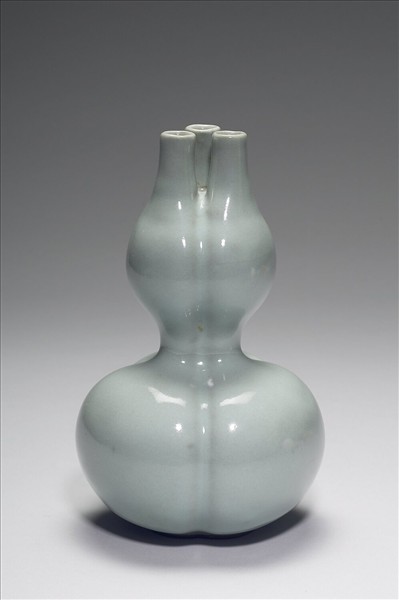 三連葫蘆瓶,器式為三葫蘆作「品」字排列併接而成,三瓣形足。全器施罩冬青釉,釉色勻淨瑩潤,圈足露胎,塗褐色汁,足內青釉地「大清乾隆年製」三行六字鈷藍篆款。