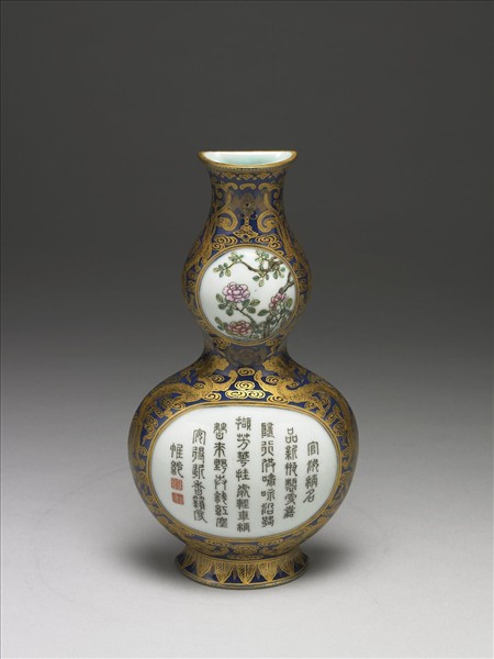 瓷胎,前方為侈口,葫蘆形腹,半圓形短圈足,後為平面,有四小圓孔,一方孔,以便吊掛於牆,本器形稱為轎瓶。器內施白釉,器表施霽青釉,前方口沿繪金彩如意雲紋,二腹圓處有開光,上繪五彩折枝玫瑰花,下以黑釉篆體書寫乾隆御詩,並有「乾」、「隆」二字朱紅印文,隙地繪金彩蝙蝠、磬、朵雲、行龍,圈足繪蕉葉紋,背部繪金彩團花紋。口緣及足底上金彩。底為白色,有紅色「乾隆年製」篆書款。與中瓷000546N000000000成對。